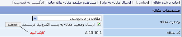 کد مقاله، عنوان مقاله، موضوع مقاله، نوع مقاله، تاریخ ارسال و فرستندهی مقاله را میبینید. شما میتوانید با فرستادن پست الکترونیک به فرستندهی مقاله، او را از وضعیت مقاله آگاه سازید. همچنین، مدیر پایگاه میتواند با توجه به خواست سردبیر ، وضعیت مقاله را تغییر دهد.